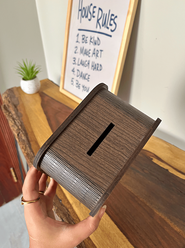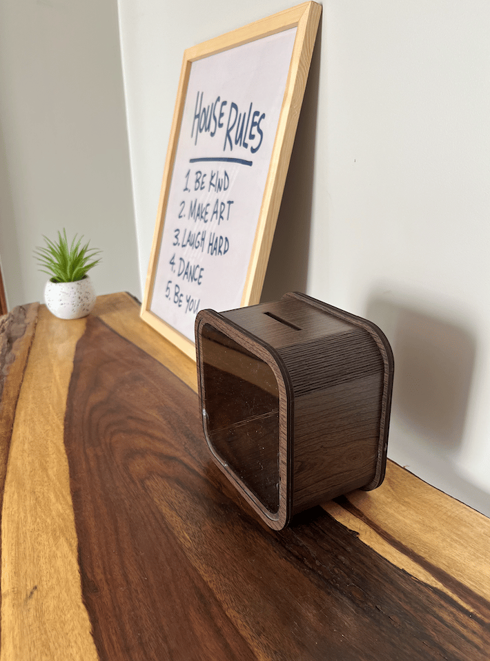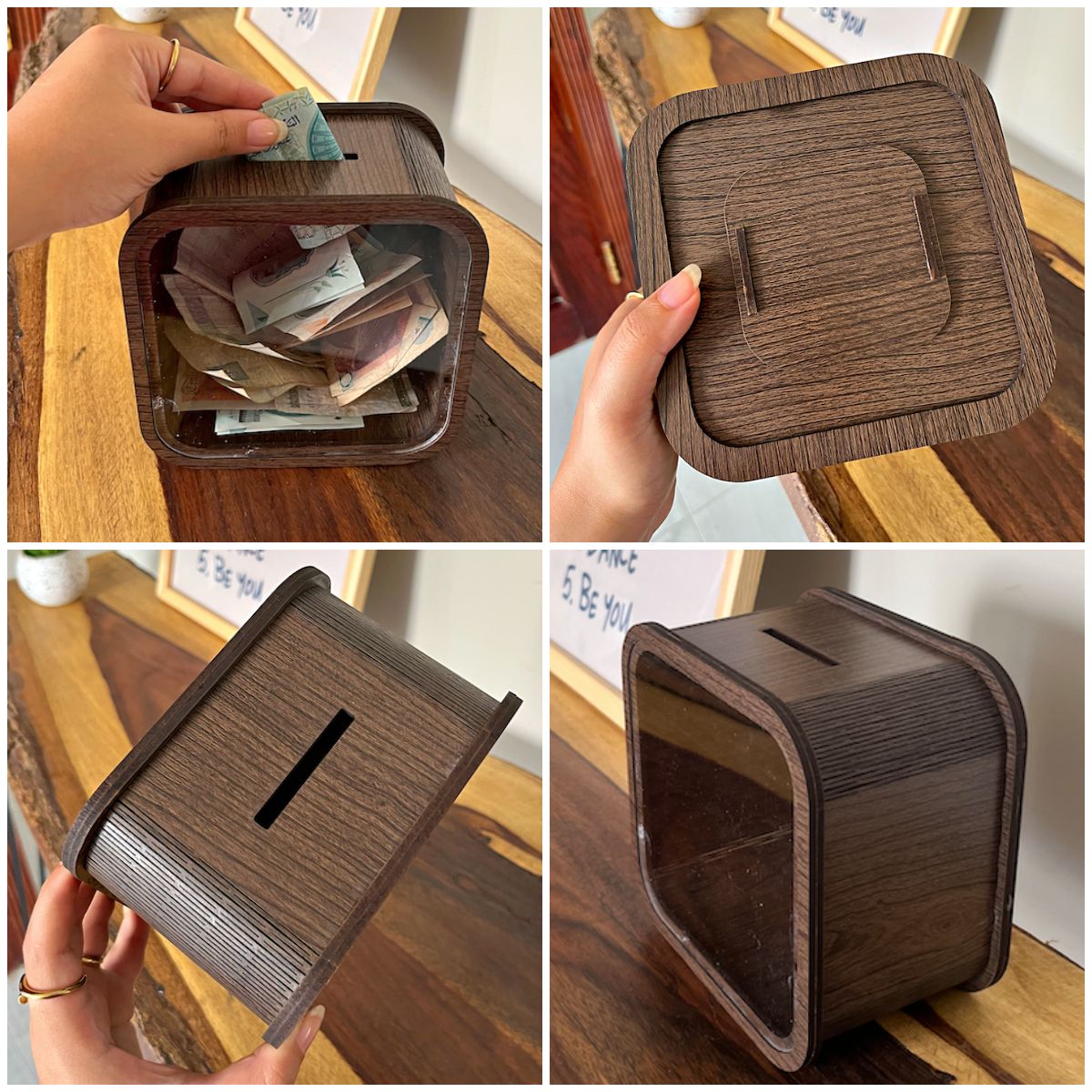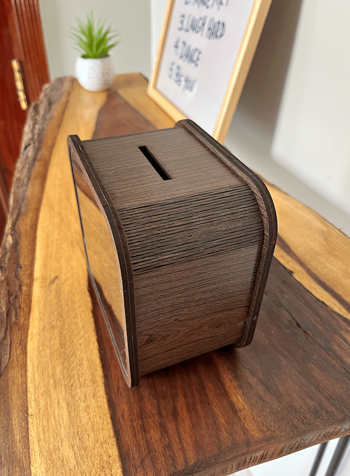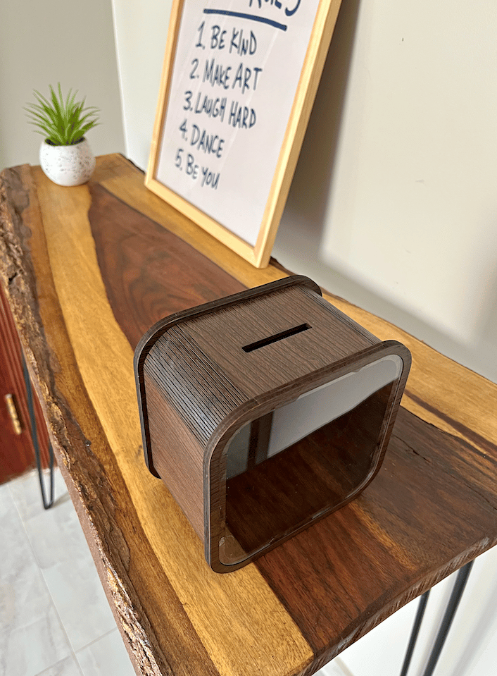 مصنوعة من خشب MDF متين مع واجهة أكريلك شفافة، بتخلي الطفل يشوف فلوسه تكبر قدام عينيه ويشعر بإنجاز كل مرة يحط فيها عملة جديدة 💰.